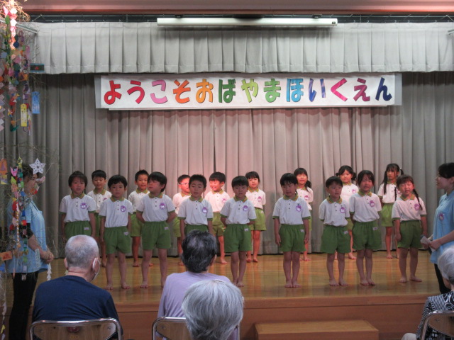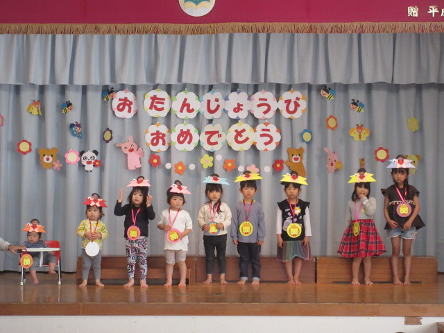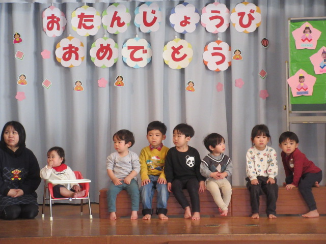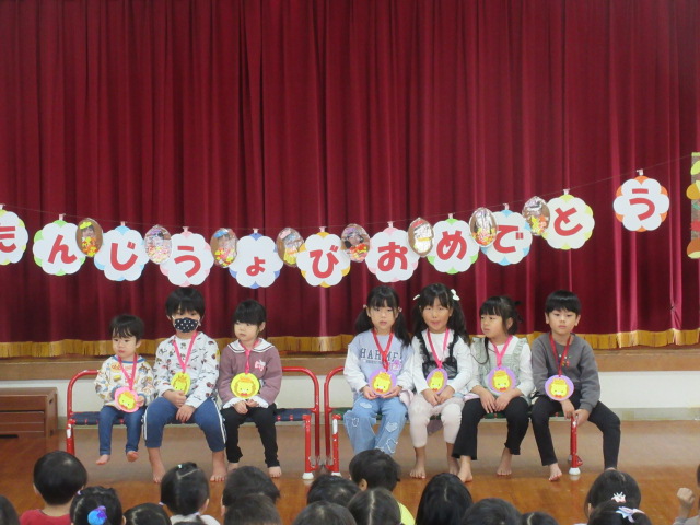 誕生児の紹介があり、みんなから「おめでとう」との言葉のプレゼントに照れながらも「ありがとう」とお返事する子どもたちでした。