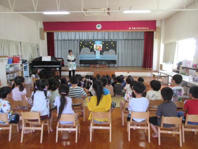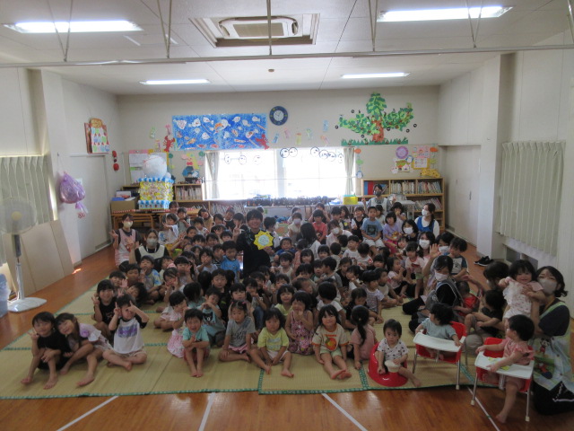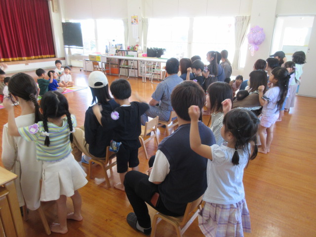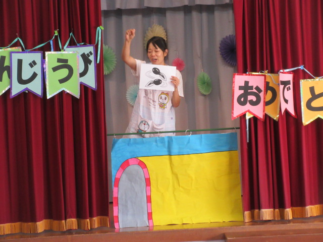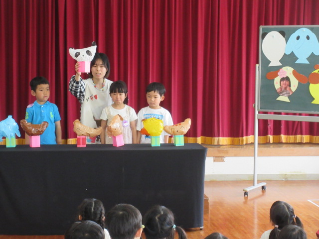 最後は先生の出し物「ばけばけばけばけ化けたくん」が夏祭りの食べ物を食べて変身するシアターをみて楽しい時間を過ごしました。