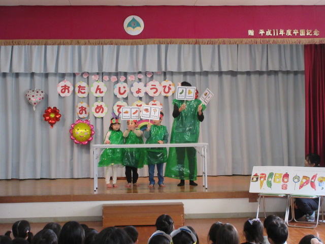 始めに、いろいろなフルーツに変身した誕生児のお友だちがステージへ上がり、フルーツポンチのダンスを披露してくれました。