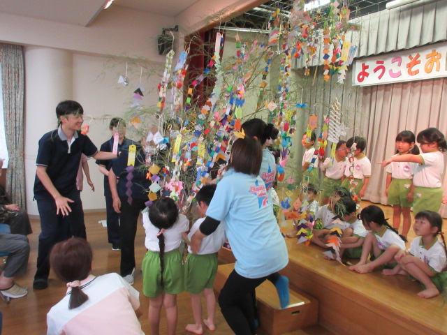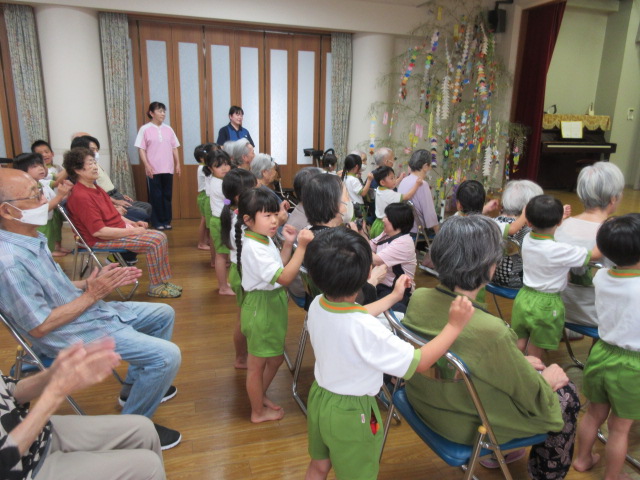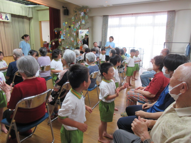 始めに、子どもたちが「今日はたくさん遊んでくださいね」とあいさつをして交流会が始まりました。「たなばた」「きらきら星」の、うたのプレゼントをしたあと、七夕の笹の交換をしました。