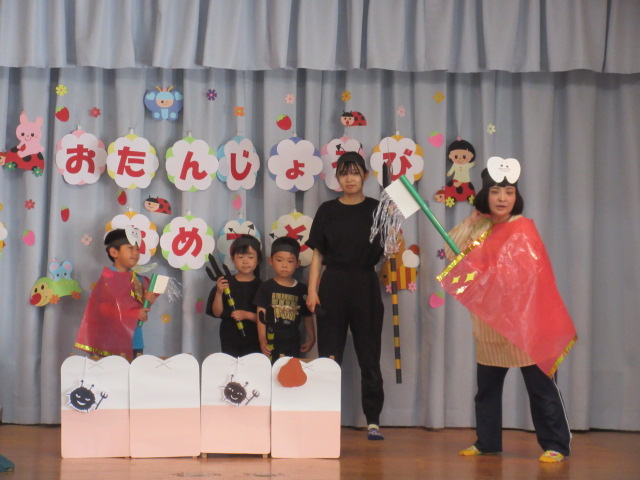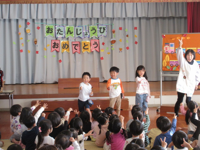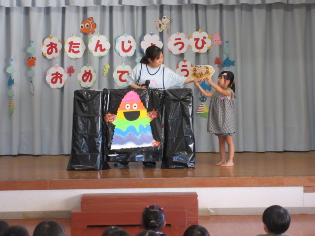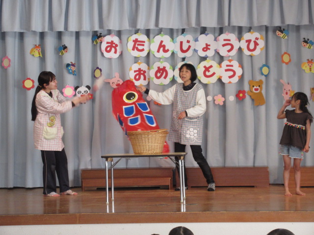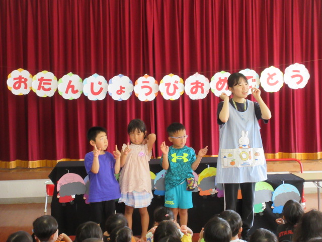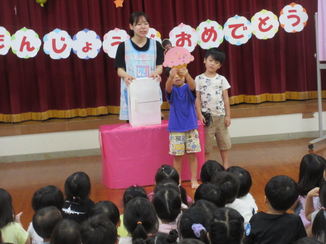 誕生児インタビューでは名前と好きな食べ物を聞かれ、堂々と答えてくれる子どもたちでした。みんなからお祝いの言葉をもらった後は、先生の出し物(マジックショー、劇「マスク屋さん」)を見て楽しい時間を過ごしました。