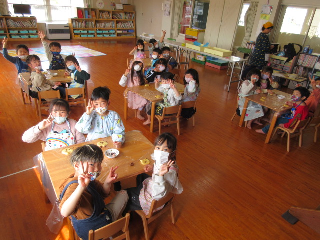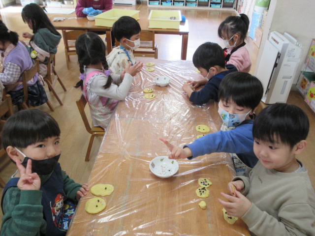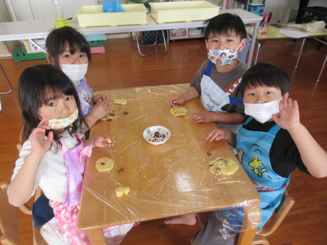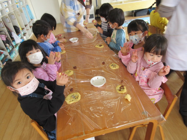 給食室で焼いてもらい3時のおやつに食べました。自分たちが気持ちを込めてつくった、かわいいクッキーなので、食べるのがもったいない・・・、と思いきや「おいしー♡」とペロリとたいらげ、大満足の子どもたちでした。