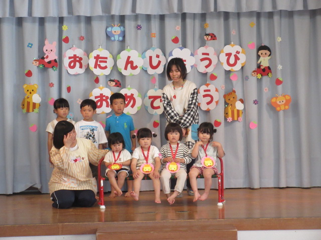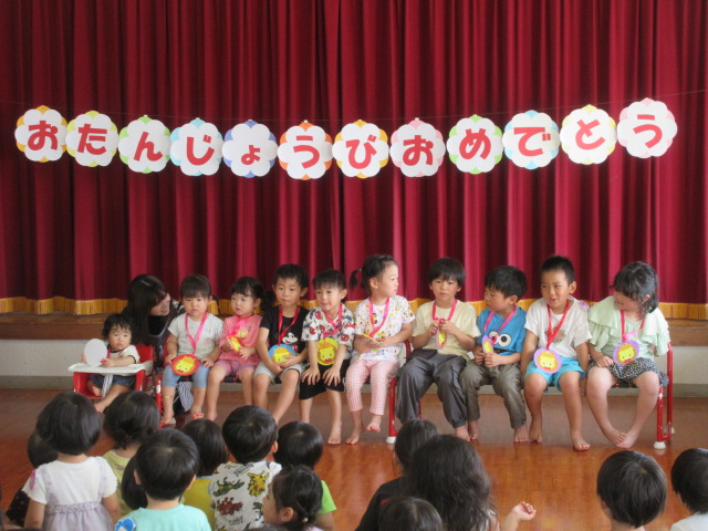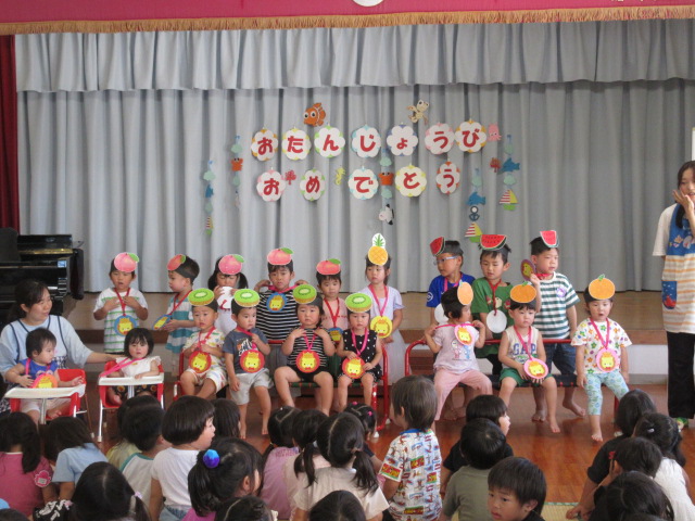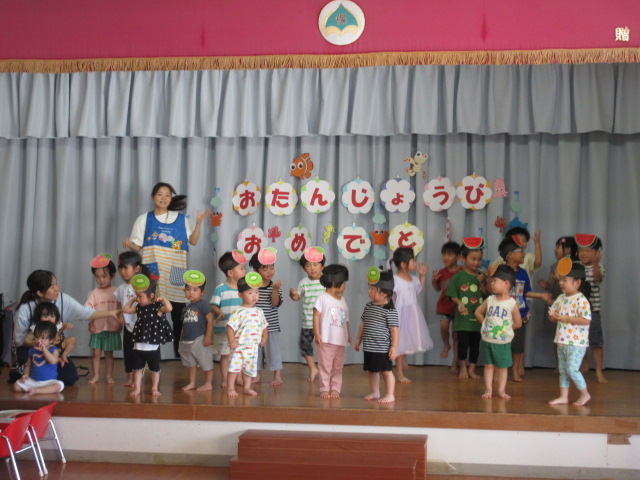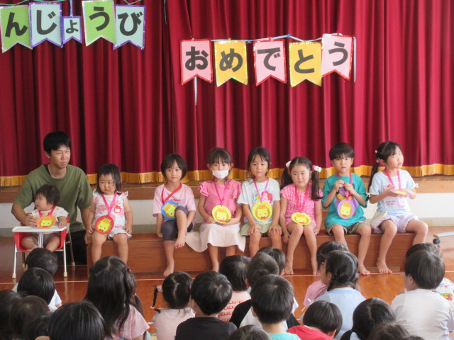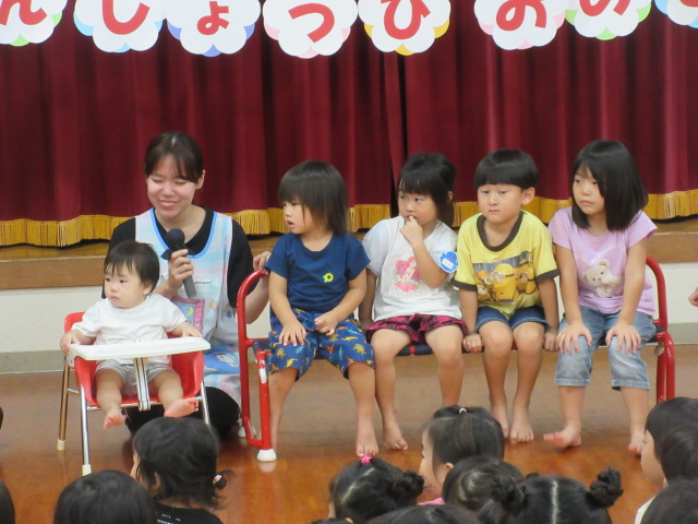 年長の誕生会当番による、アイスクリームの手遊びで会が始まり、8月生まれのお友だちが紹介されました。