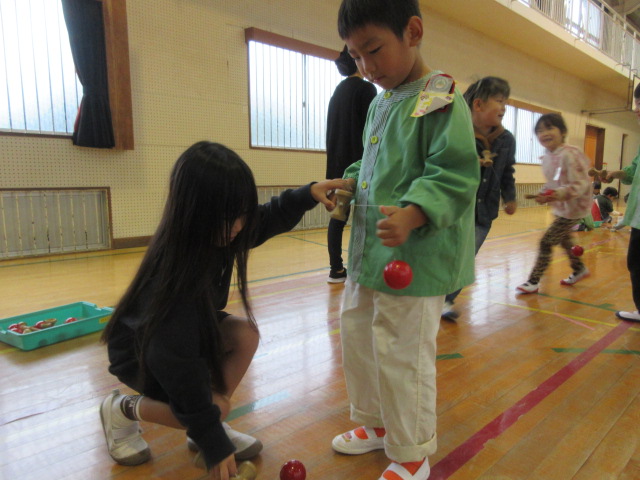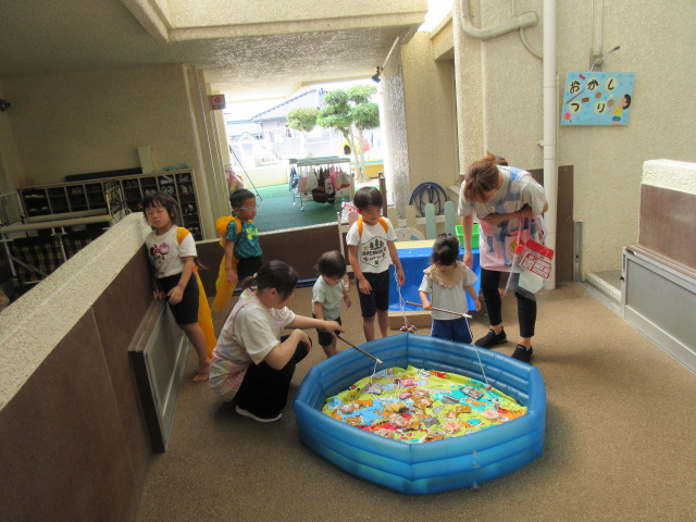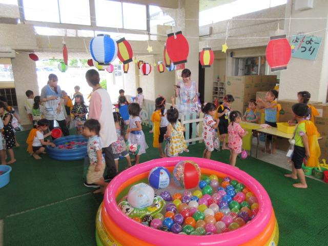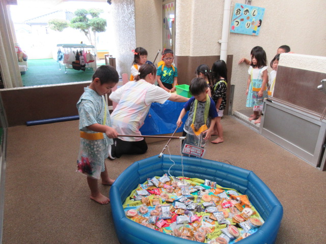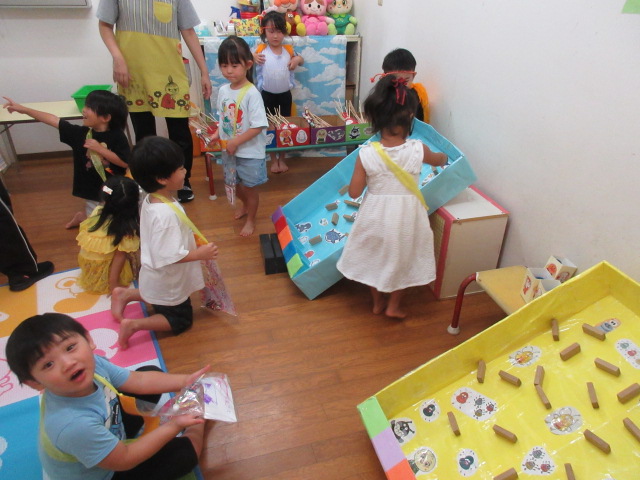 そのあとは、「金魚すくい」「風船つり」「おかし釣り」「ころころボール」のお店に行って、ゲームをして楽しみました。「紫色のふうせんとったよ」「だるまとった!」と、嬉しそうにとったものを話す子どもたちでした。