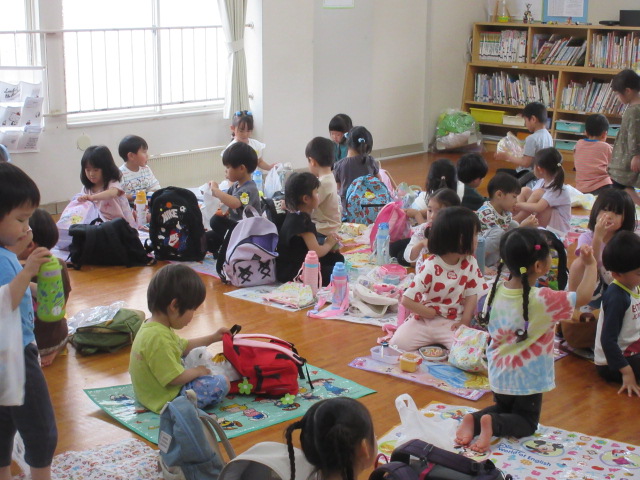 「パトカーおったよ!」と、ふれあい館の話をしてくれたり、「見て~!ピクミンのお弁当!」と、お弁当を広げて喜ぶ子どもたちの姿もあり、お天気は残念でしたが、それぞれ楽しい時間を過ごしました。