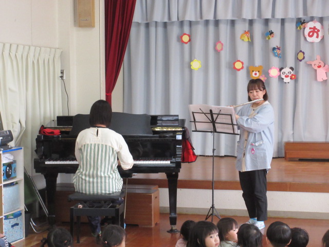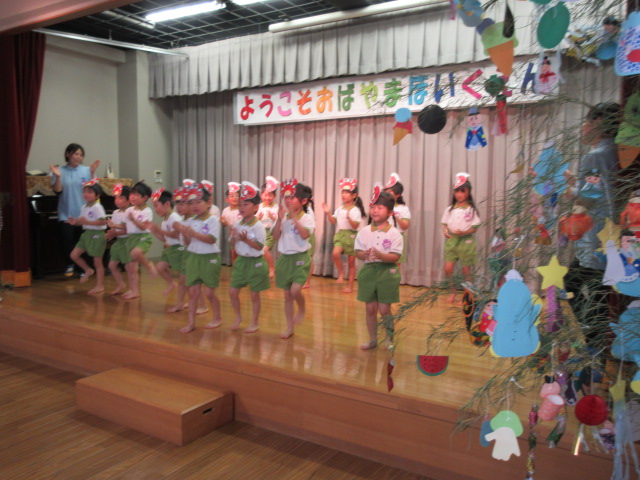 保育士による「こいのぼりの劇」「マジック」「フルートとピアノ演奏」を見た後、さいごに年長さんによる、「エビカニクス」のダンスを見ました。