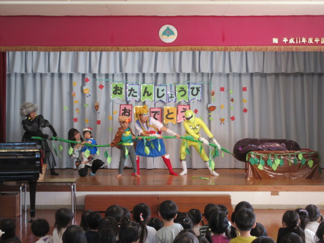 最後は、ハロウィンが近いこともあり、セーラームーンやアンパンマン、キティちゃん、湯ばぁば、黄レンジャーによる、「大きなさつまいも」の劇を見て、大いに盛り上がりました。