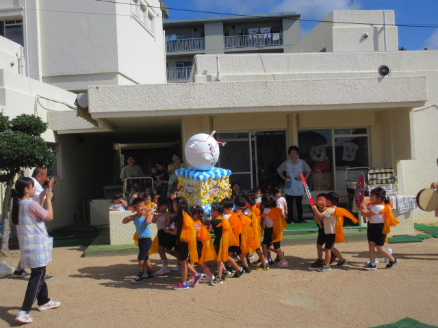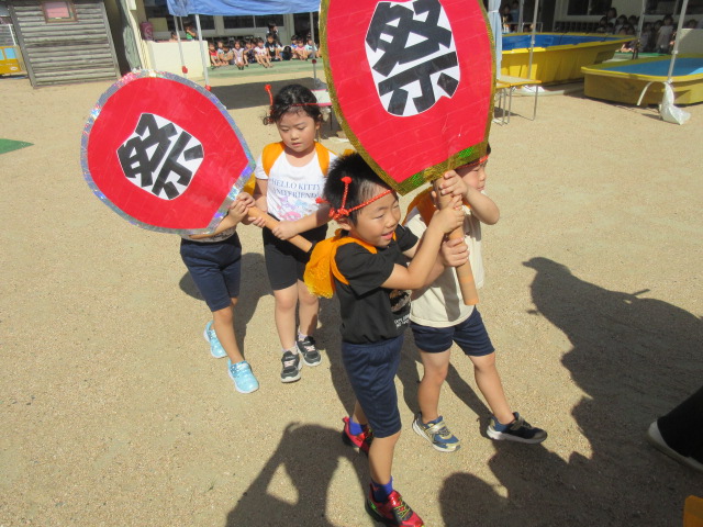 始めに、年長さんが手作りの神輿を担いで、園庭を歩きました。「わっしょい!わっしょい!」と元気のいい掛け声でお祭りの雰囲気を作ってくれました。
