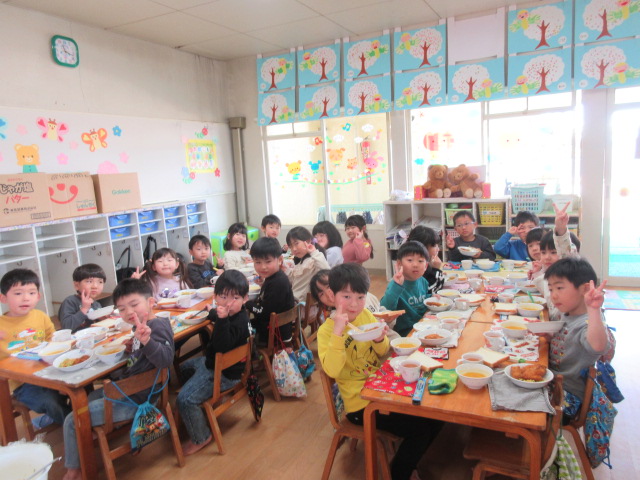 給食はお祭りメニューのやきそば、からあげ、フライドポテトを美味しく食べました。「ポテトおいしいね」「お肉(からあげ)おかわり」と沢山食べて大満足の様子でした。