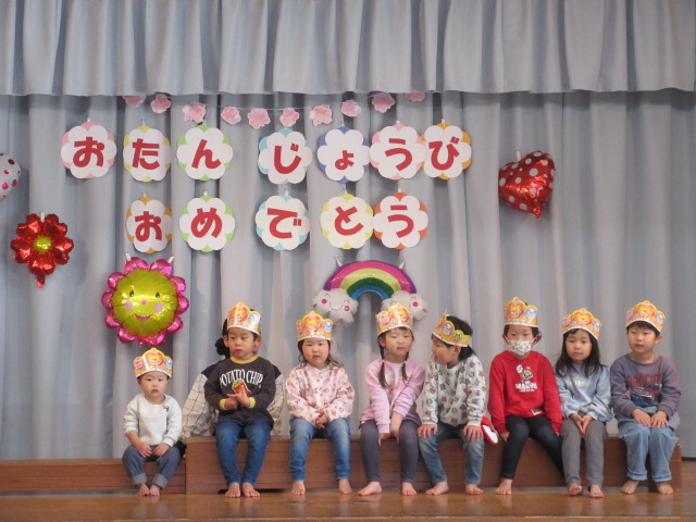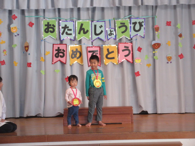 みんなに「お誕生日おめでとう」の言葉のプレゼントをもらい、「ありがとうございます」と嬉しそうに返事をする誕生児たちです。