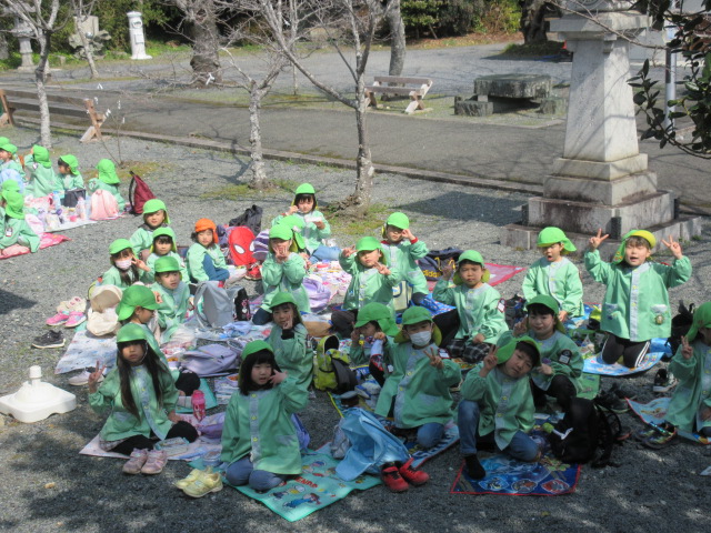 護国神社では、神様に「元気に過ごせますように」と祈願し、各クラスでダンスの見せ合いっこをして過ごした後、お弁当を食べました。