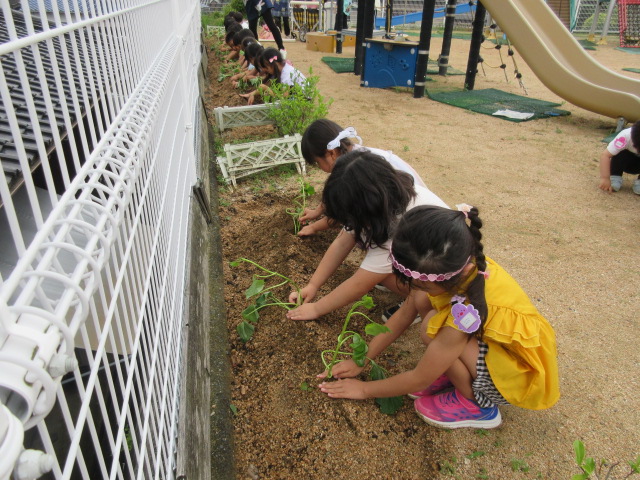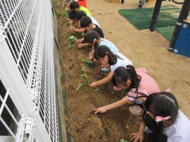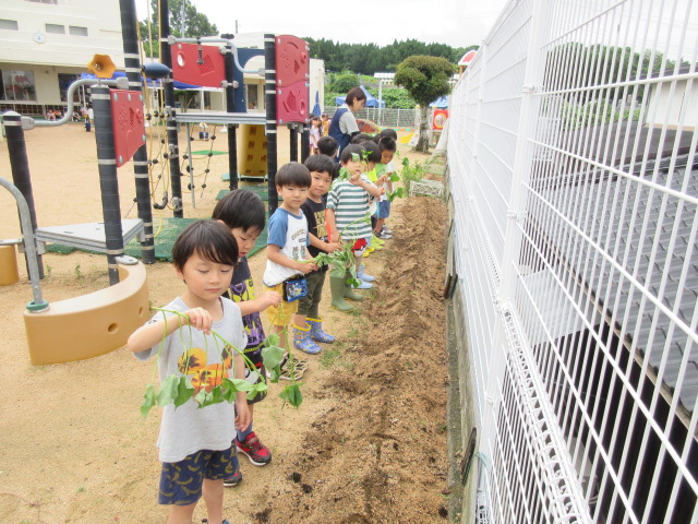 年長~年少さんは近くの畑にさつまいもの苗を植えに行く予定でしたが、昨日からの雨で地面がぬかるんでいること、雨が今にも降りだしそうな空模様のため中止とし、雨が止んだ時を狙って年長さんだけが園庭の畑に苗植えをしました。
