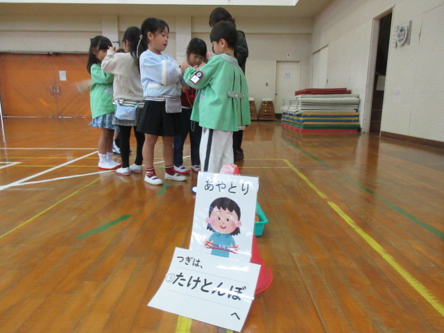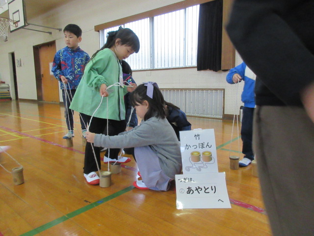学校に着いて、1年生とあいさつをしたあと、1年生に昔あそびを教えてもらいながら、楽しい時間を過ごしました。
