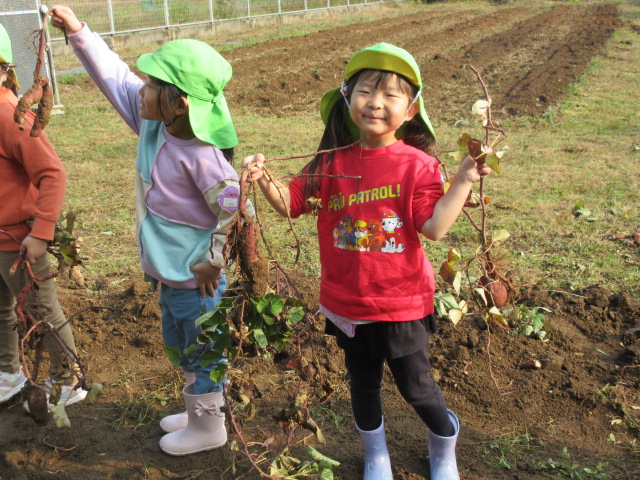 ですが、芋ほりをした年長さんたちは「いっぱいあるー!」「見てみて!これ大きいよ」と大興奮!「楽しかった!」「この大きいの持って帰るけぇ」と、子どもたちは、芋ほりを楽しんでくれました。