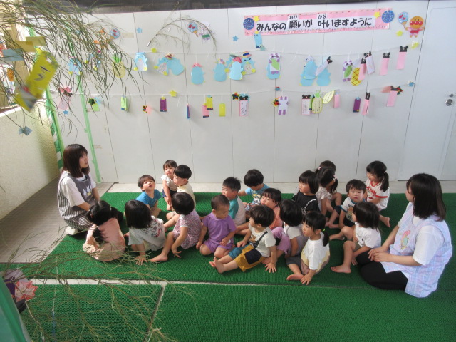 園では七夕の劇を見たり、絵本や紙芝居をみたり、七夕の曲を歌ったりと七夕について学びました。
