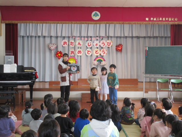 誕生児はステージに上がり、インタビューでは「名前」「好きな色」を聞かれ、元気よく答えてくれました。みんなから、お祝いの言葉のプレゼントをもらい、「ありがとう」と嬉しそうな主役の子どもたちでした。