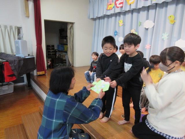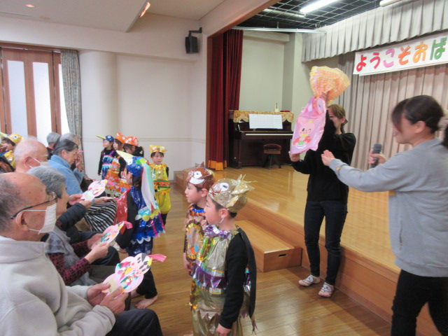 「うれしいひなまつり」の歌を、おじいさん、おばあさんと一緒に歌ったり、「あんたがたどこさ」「かたたたき」「ままがいうには」の手遊びをして楽しんだ後、最後は、発表会でもおこなった「あしたはれる」のダンスと歌「いのちの歌」を披露し、見てもらいました。プレゼントに手作りの雛人形を渡した後、最後は、一人ずつ手をタッチして、別れを惜しみました。