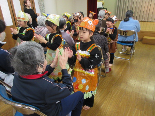今回は、手遊び、歌、和太鼓、ダンスを見てもらいました。手遊びでは、「ママが言うには」「あんたがたどこさ」を好生園のおじいさん、おばあさんも一緒に行っていただき、とても盛り上がりました。