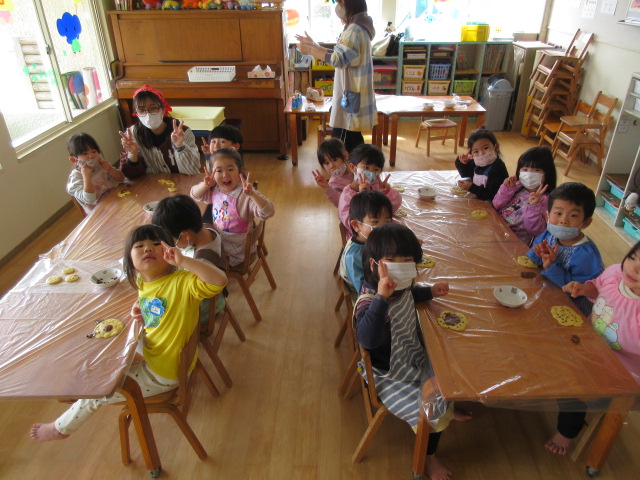 給食室で焼いてもらい3時のおやつに食べました。自分たちが気持ちを込めてつくった、かわいいクッキーなので、食べるのがもったいない・・・、と思いきや「おいしー♡」とペロリとたいらげ、大満足の子どもたちでした。