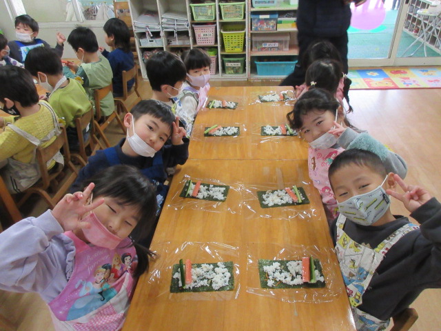 幼児クラスは、恵方巻づくりもして、無病息災を願いながら頂きました。