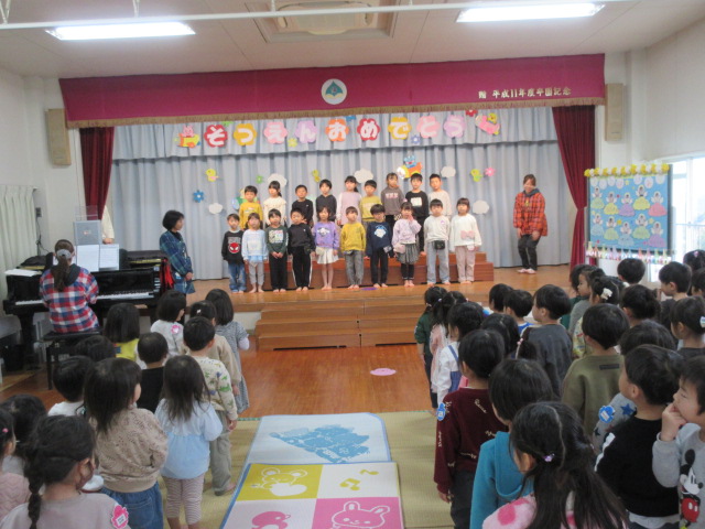 もうすぐ卒園のふじくみの子どもたちと、在園児で「ありがとうさよならの会」を行いました。