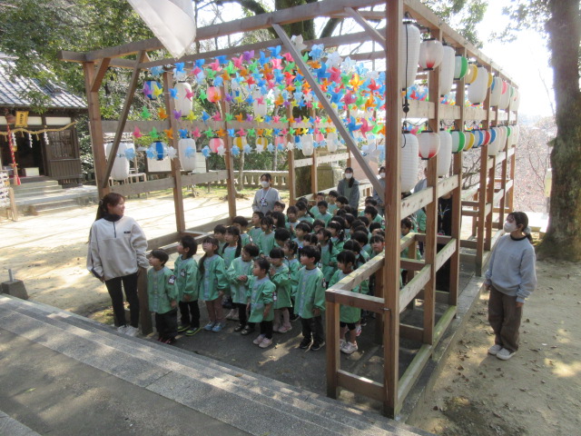 年長~年少クラスは、近くの護国神社へ、3歳未満児は園の周りや近くの公園にお散歩に行きました。