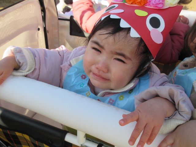 自分たちで作った、鬼の面をかぶって、手には升を持ち、鬼に向かって勇敢に豆を投げつけました。「鬼はそと!」と元気よく声を出して鬼を退治しました。最後は、鬼と体操を一緒にして、記念写真も撮りました。